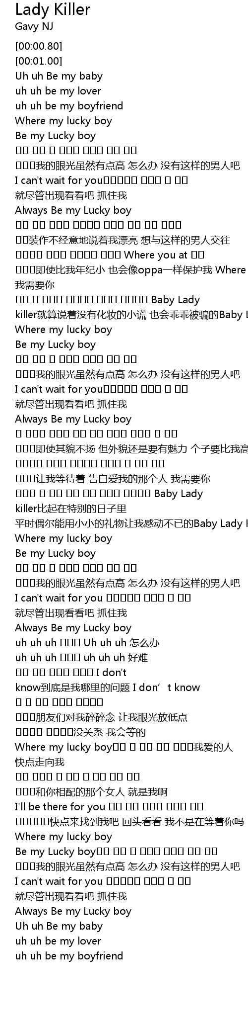 | [00:55.16] | Baby Lady killer jiu suan shuo zhe mei you hua zhuang de xiao huang ye hui guai guai bei pian de Baby Lady killer |
