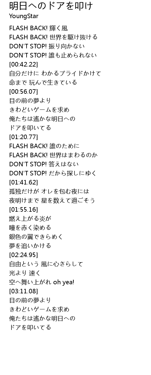 | [03:22.42] | 俺たちは遙かな明日への |