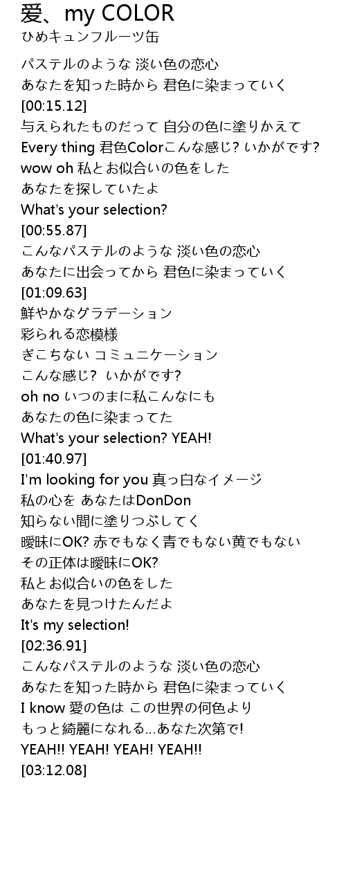 | [02:43.63] | あなたを知った時から 君色に染まっていく |