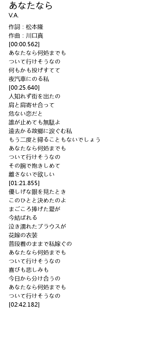 | [02:03.129] | 普段着のままで私嫁ぐの |