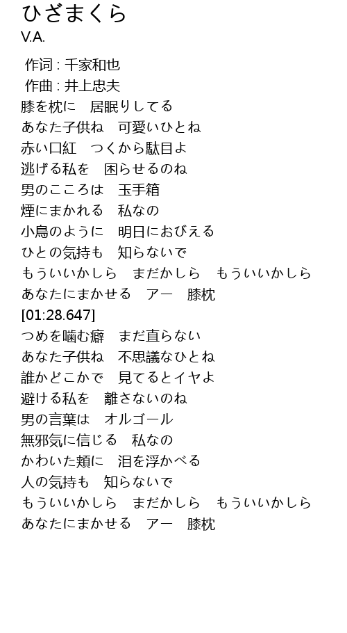 | [01:21.672] | あなたにまかせる アー 膝枕 |