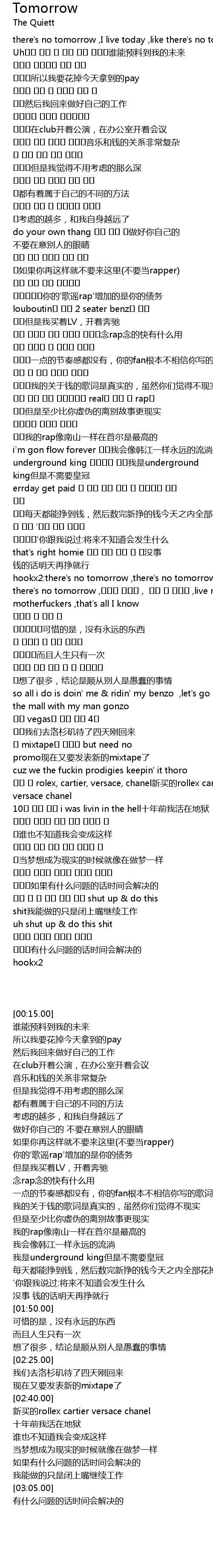| [01:50.00] | hookx2:there's no tomorrow ,there's no tomorrow ,I live today ,like there's no tomorrow ,내일이 있을지 , 그건 잘 몰라도 ,live now motherfuckers ,that's all I know |