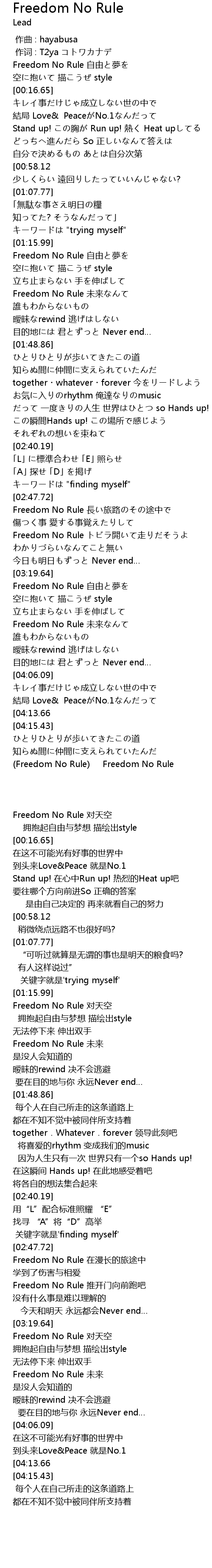 | [04:20.85][04:13.66] | (Freedom No Rule) Freedom No Rule |