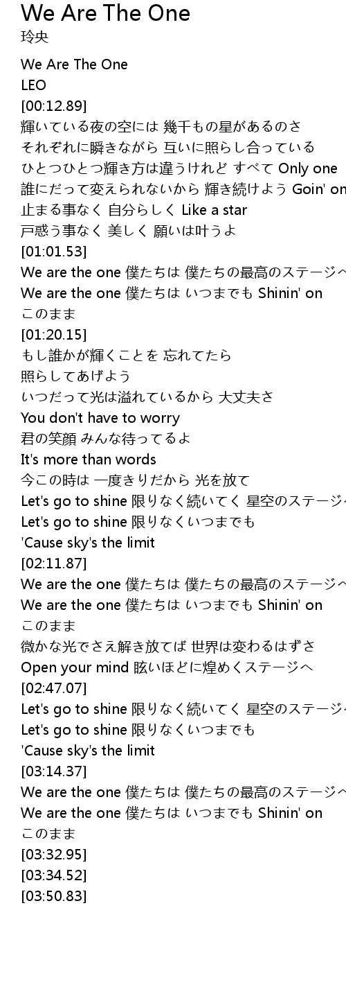 | [03:22.11] | We are the one 僕たちは いつまでも Shinin' on |