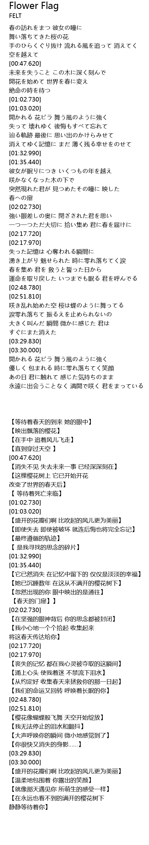 | [03:48.110] | 永遠に出会うことなく 満開で咲く 君をまっている |