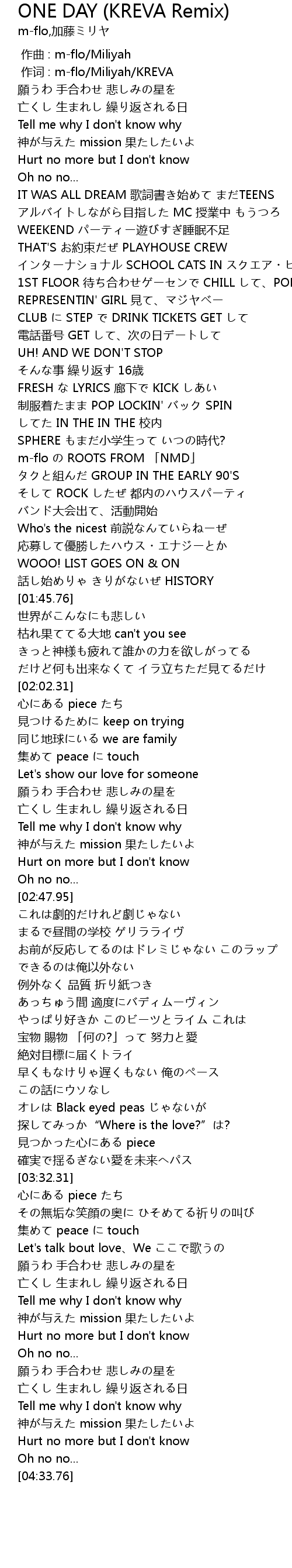 | [00:01.00] | 作词 : m-flo/Miliyah/KREVA |