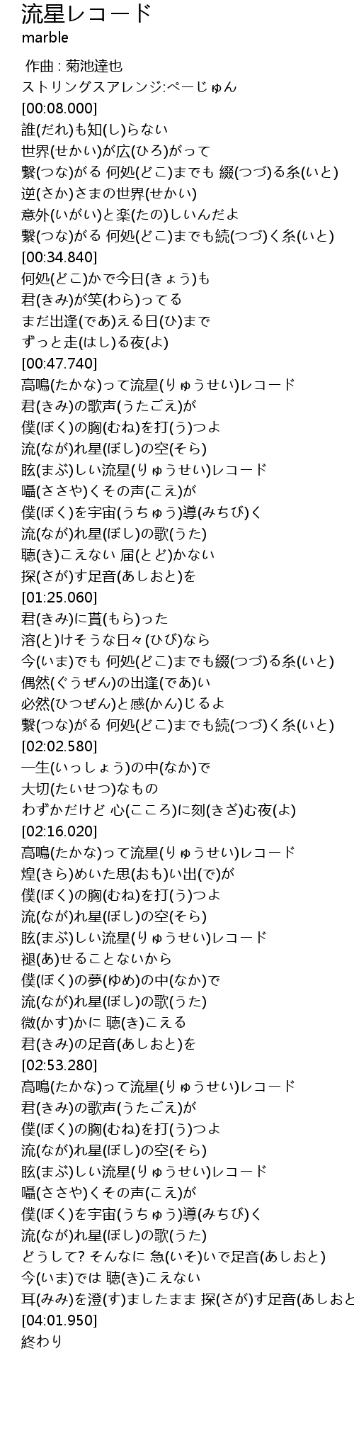 | [03:39.290] | 僕(ぼく)を宇宙(うちゅう)導(みちび)く 流(なが)れ星(ぼし)の歌(うた) |