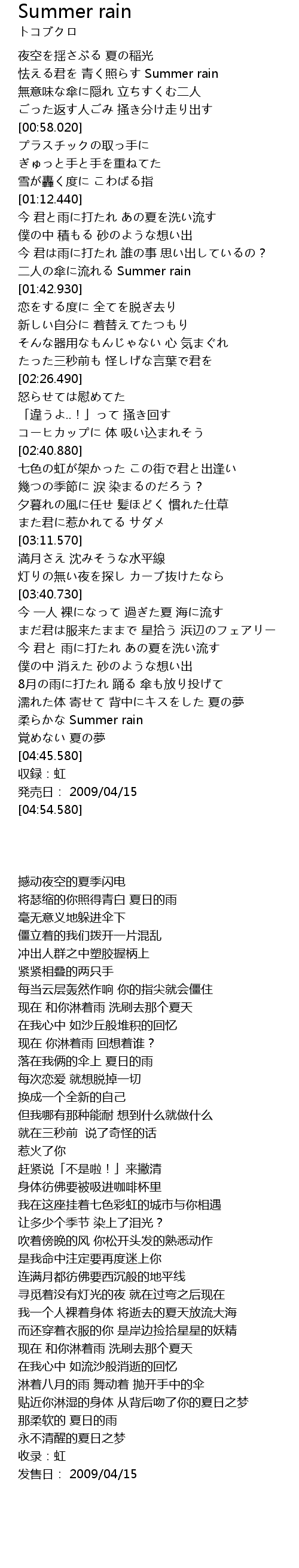| [01:35.690] | 二人の傘に流れる Summer rain |