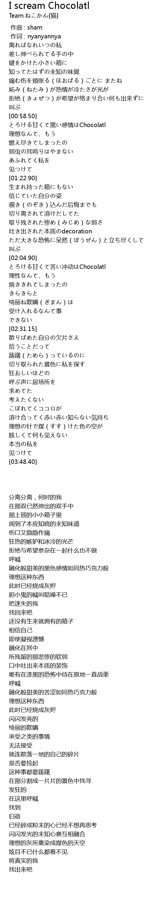 | [00:59.40] | とろける甘くて黒い感情はChocolatl |