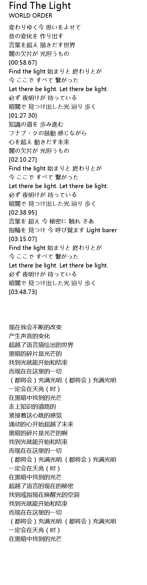 | [03:20.69] | Find the light 始まりと 終わりとが |