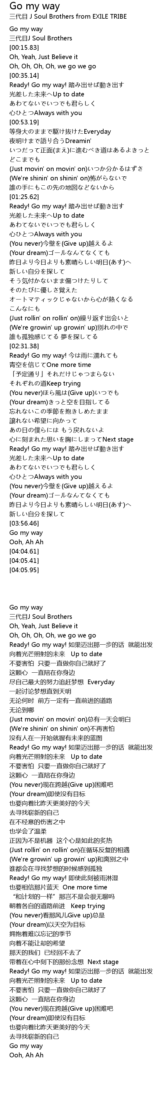 | [03:22.72] | Ready! Go my way! tà chū dòng chū |
