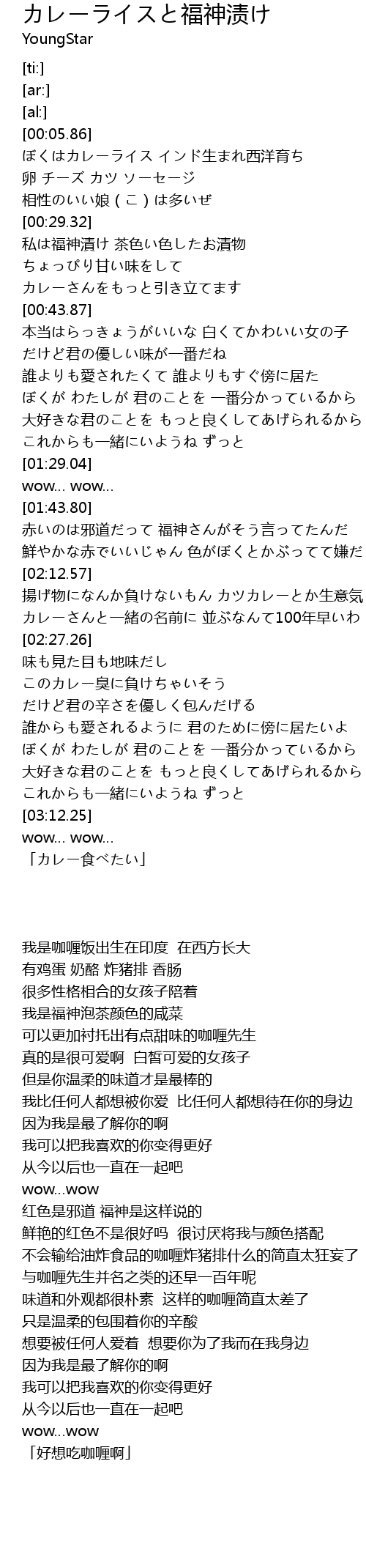 | [02:21.06] | カレーさんと一緒の名前に 並ぶなんて100年早いわ |
