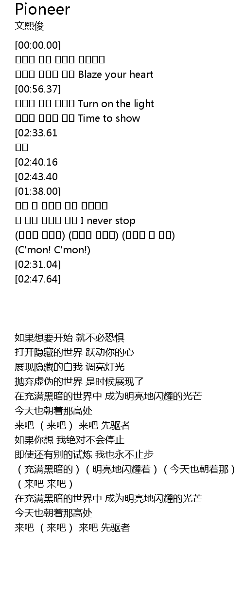 | [01:33.19][02:43.40] | C'mon! (C'mon!) C'mon! Pioneer |