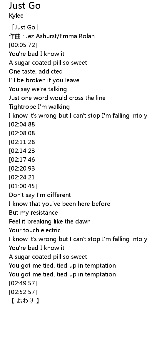 | [02:46.10][02:24.21][01:46.93][00:57.11] | Don' t speak just go |