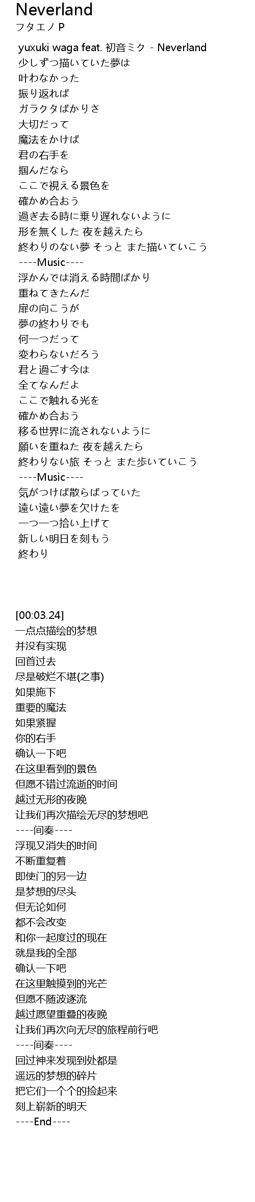 | [00:03.24] | yuxuki waga feat. 初音ミク - Neverland |