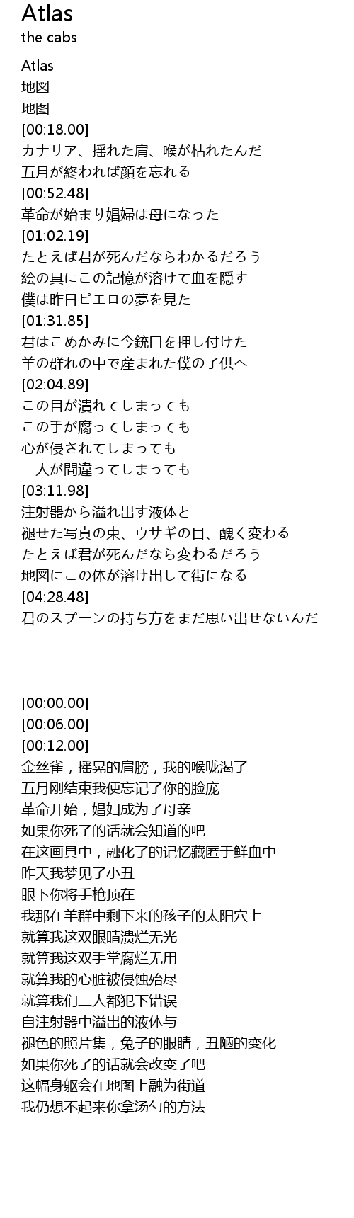 | [00:34.17] | カナリア、揺れた肩、喉が枯れたんだ |