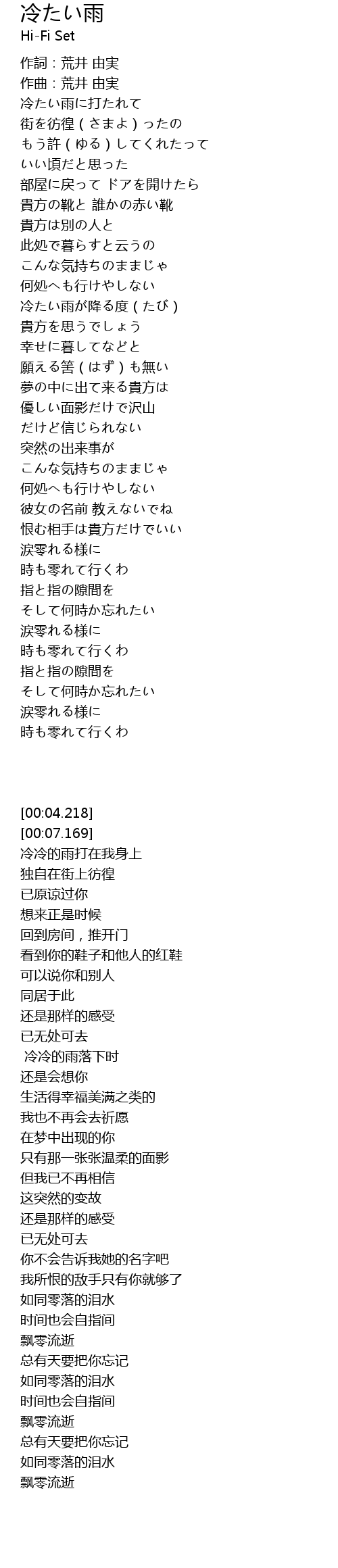 | [00:13.844] | 冷たい雨に打たれて |