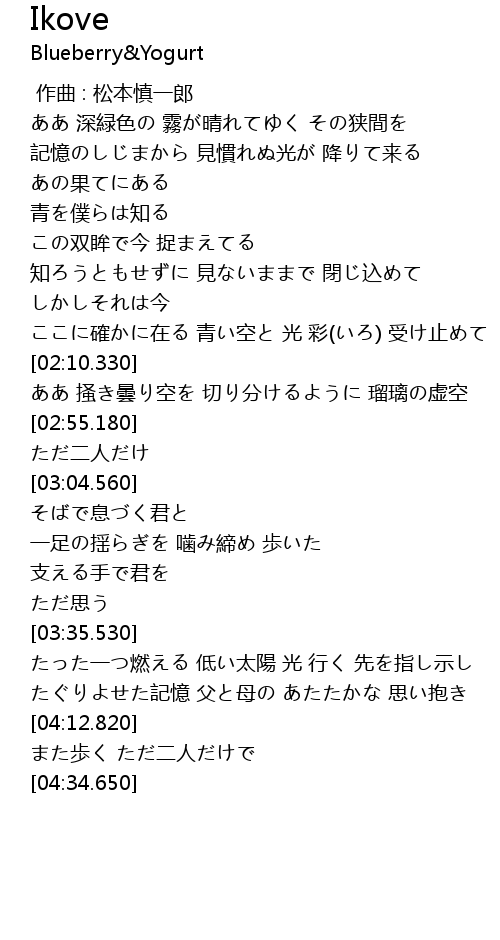 | [02:38.300] | ああ 掻き曇り空を 切り分けるように 瑠璃の虚空 |