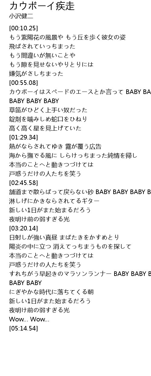 | [00:55.39] | カウボーイはスペードのエースとか言って BABY BABY BABY BABY BABY |