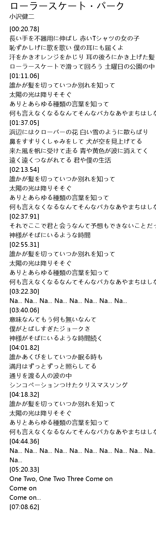| [01:02.62] | ローラースケートで滑って回ろう 土曜日の公園の中 |