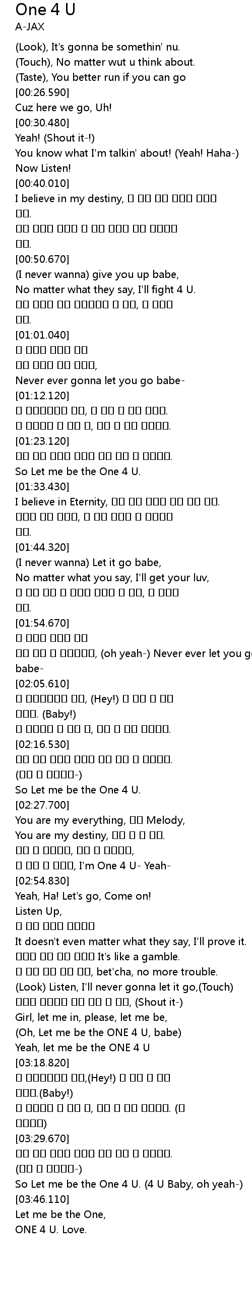 | [03:16.090] | Oh, Let me be the ONE 4 U, babe |