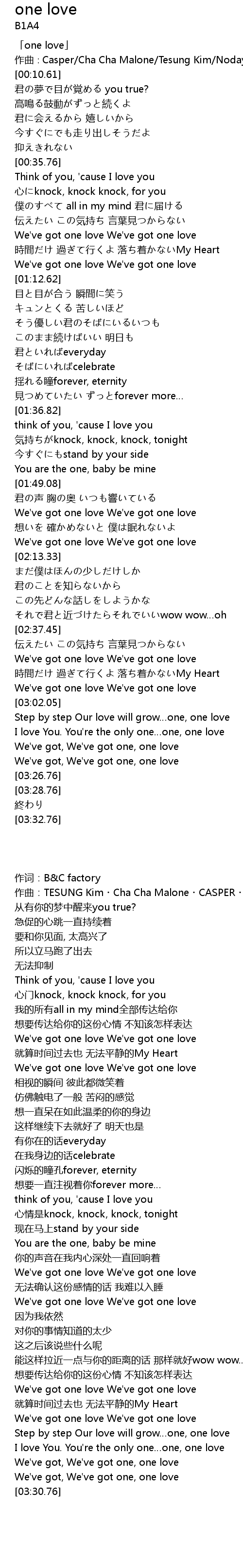 | [03:02.66] | Step by step Our love will grow…one, one love |