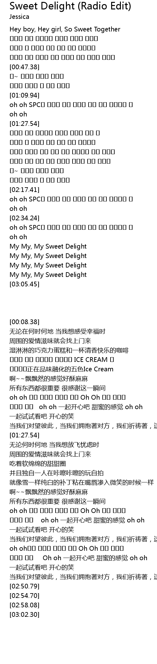 | [00:08.38] | Hey boy, Hey girl, So Sweet Together |