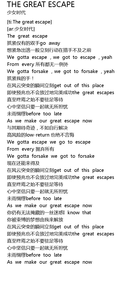 | [00:43.26] | jí shǐ yù zhào yě bú huì fàng guò dì wán měi chéng gōng the great escapes |