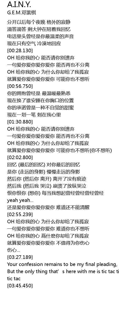 | [01:38.930] | yi ju ai ni ai ni ai ni ai ni neng fou zai ye bu fen li |