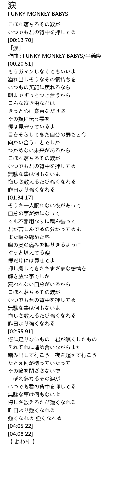 | [00:18.51] | 作曲∶FUNKY MONKEY BABYS/平義隆 |