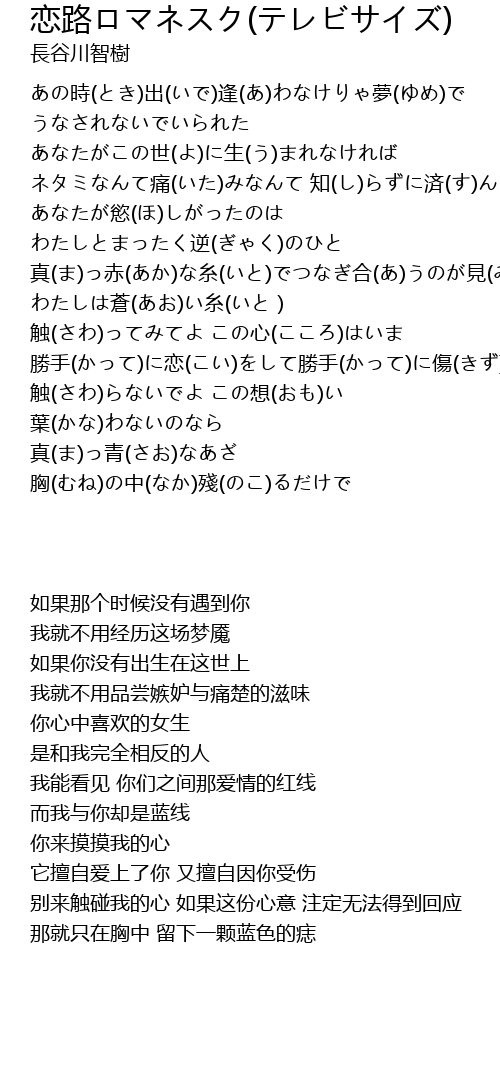 | [01:04] | 勝手(かって)に恋(こい)をして勝手(かって)に傷(きず)ついてる |