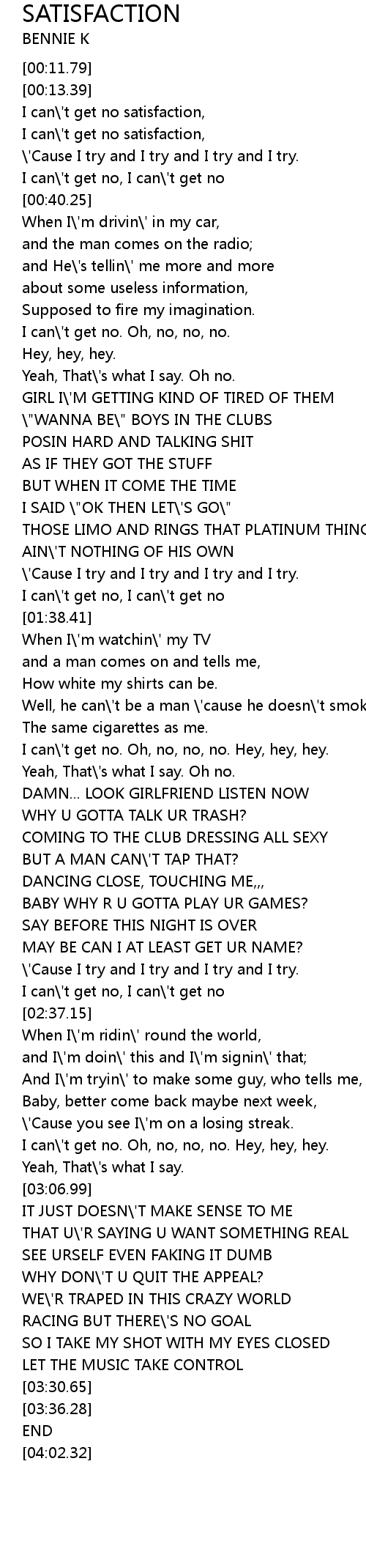 | [00:58.71] | I can\'t get no. Oh, no, no, no. |