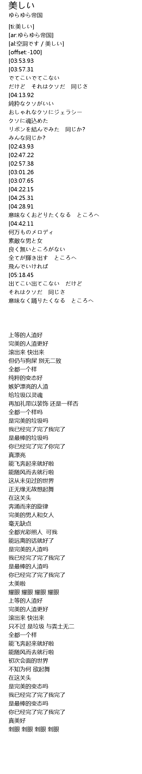 | [01:19.29][02:43.93][04:50.07] | 完璧なクソか |