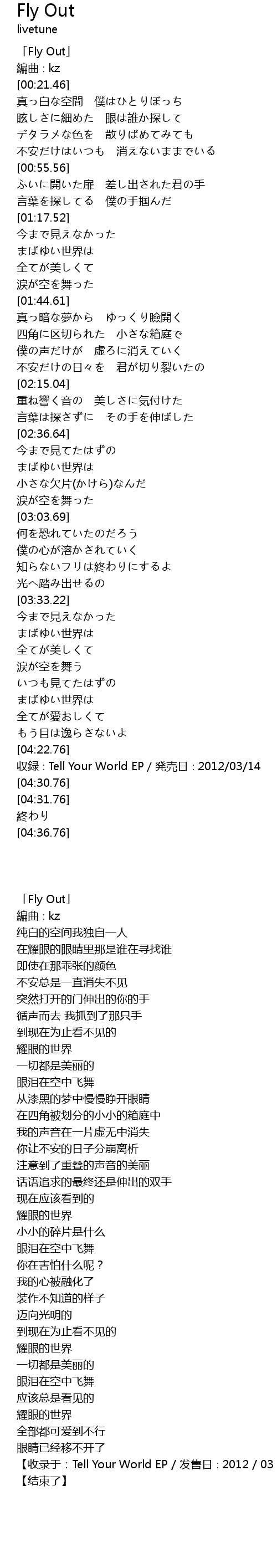 | [04:24.76] | shou lu Tell Your World EP fa mai ri 2012 03 14 |