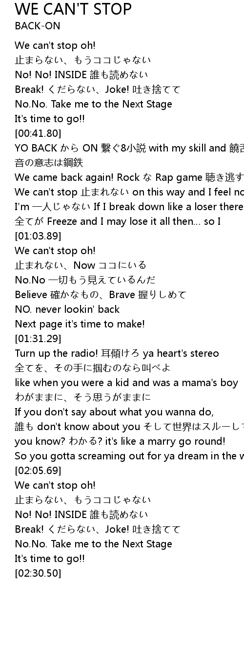 | [00:53.78] | We can't stop 止まれない on this way and I feel no pain cuz |