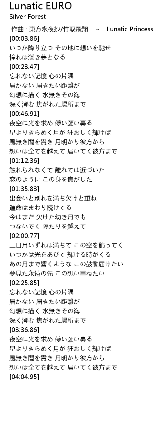 | [00:00.00] | 作曲 : 東方永夜抄/竹取飛翔 ~ Lunatic Princess |