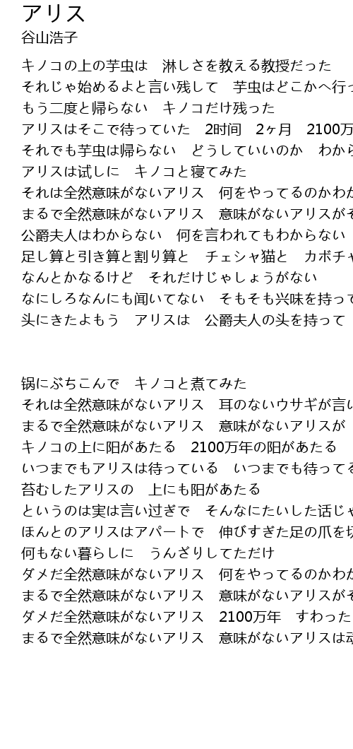 | いつまでもアリスは待っている いつまでも待ってる石になって | |