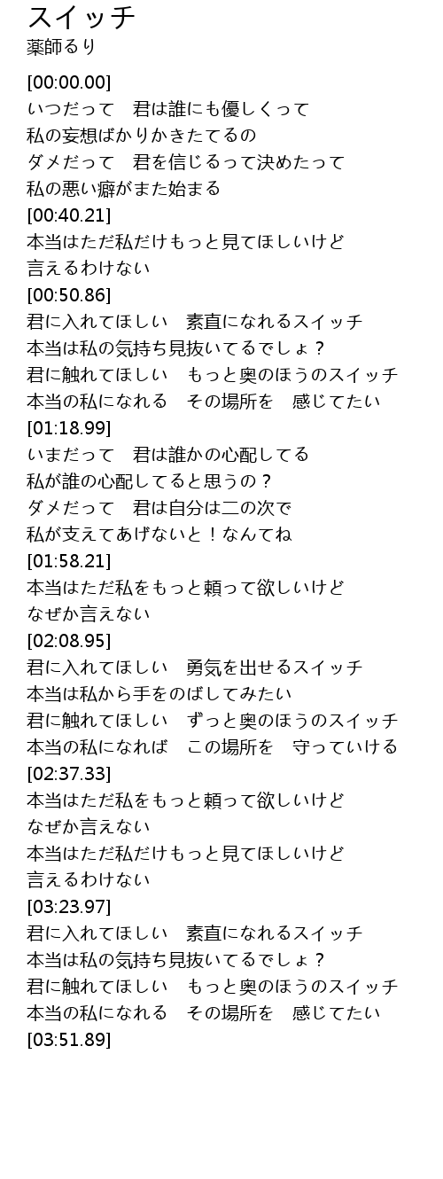 | [02:09.69] | 君に入れてほしい 勇気を出せるスイッチ |