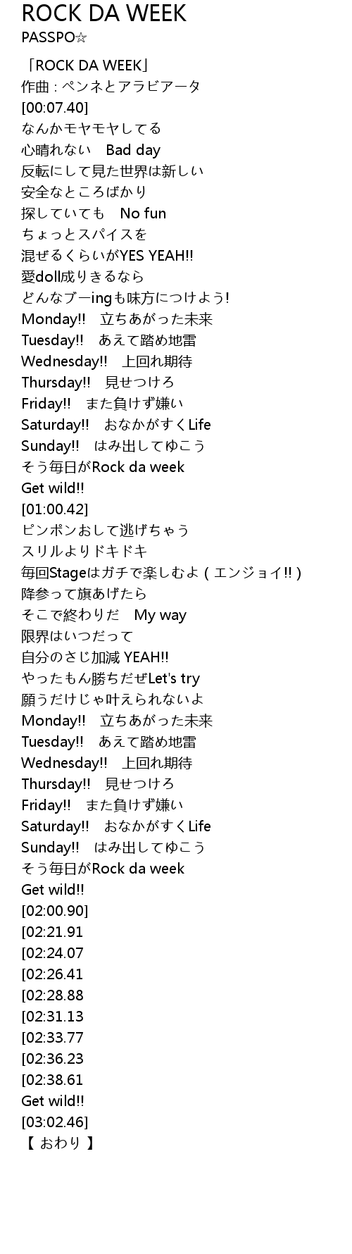 | [02:57.66][02:38.61] | そう毎日がRock da week |