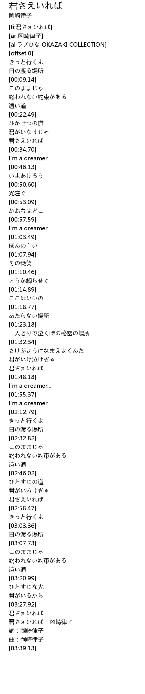 | [03:33.54] | 君さえいれば - 冈崎律子 |