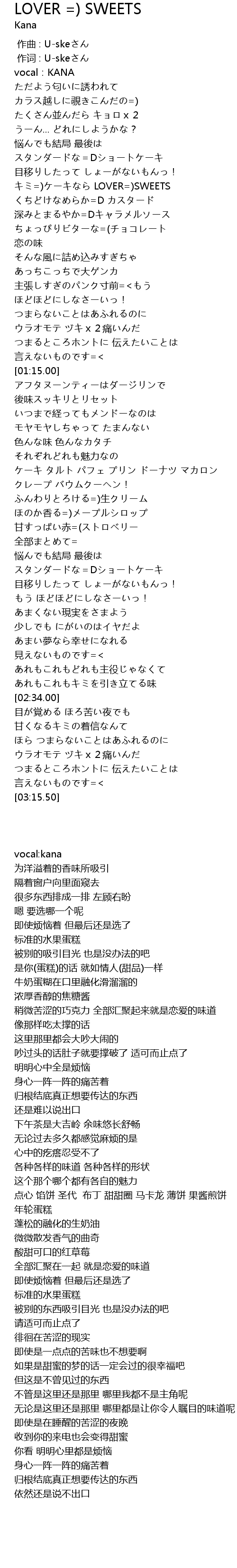 | [00:38.90] | キミ=)ケーキなら LOVER=)SWEETS |