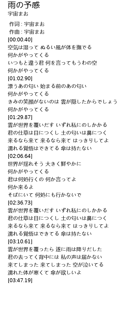 | [03:20.45] | 雲が世界を覆ったら 遂に雨は降りだした |