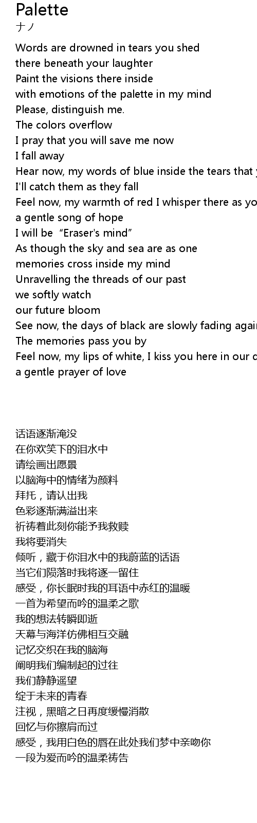 | [01:18.02] | Hear now, my words of blue inside the tears that you cry |