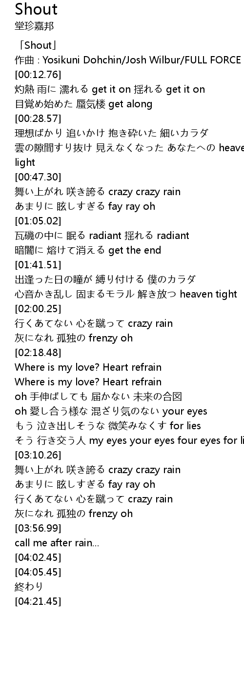 | [00:13.76] | 灼熱 雨に 濡れる get it on 揺れる get it on |