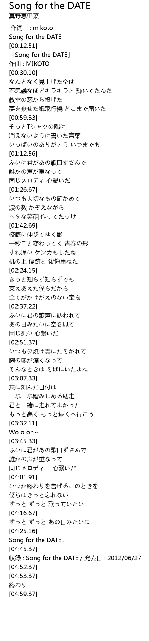 | [04:47.37] | 収録∶Song for the DATE/発売日∶2012/06/27 |