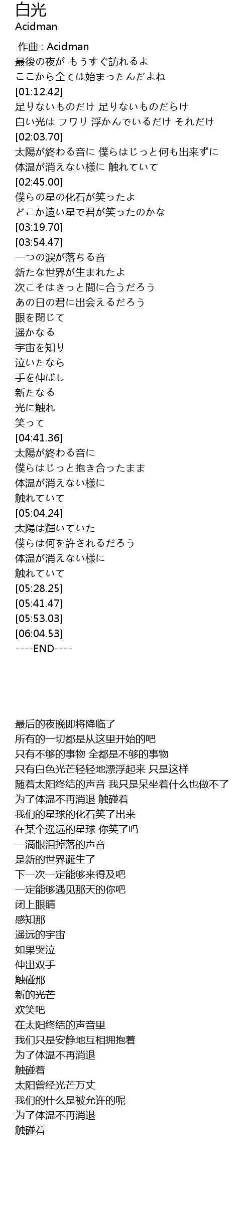 | [01:45.72] | 白い光は フワリ 浮かんでいるだけ それだけ |
