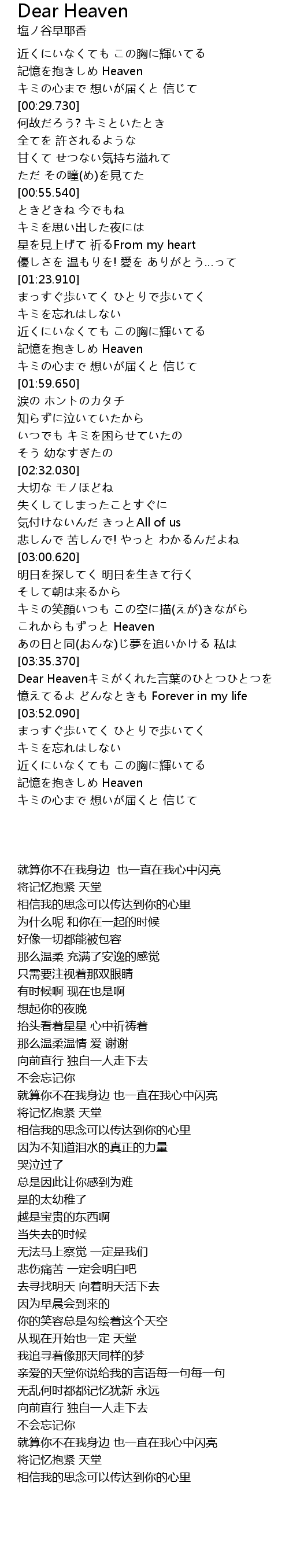 | [03:36.750] | Dear Heavenキミがくれた言葉のひとつひとつを |
