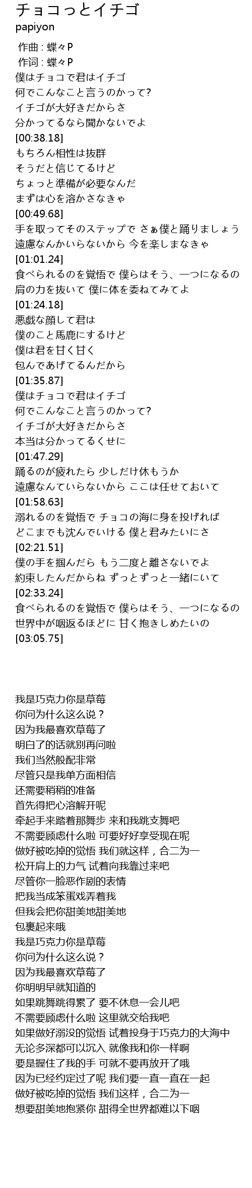| [00:15.54] | 僕はチョコで君はイチゴ |