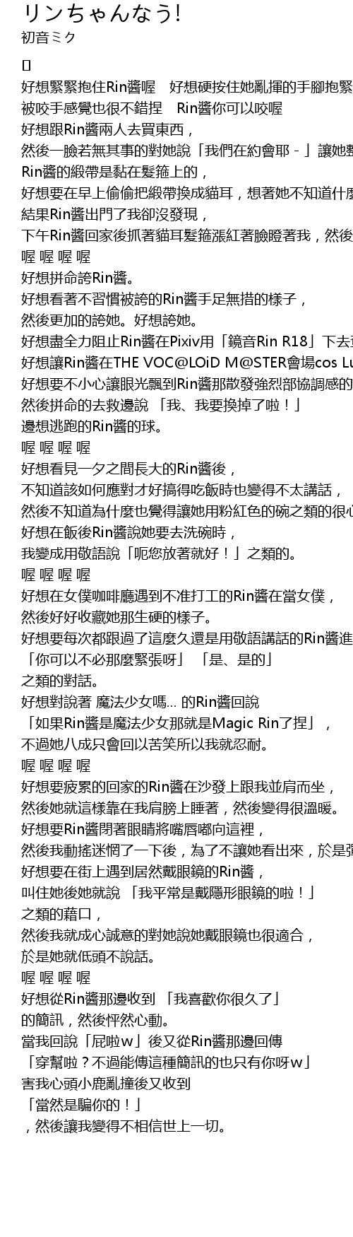 | [00:46.213] | 好想盡全力阻止Rin醬在Pixiv用「鏡音Rin R18」下去查。 |