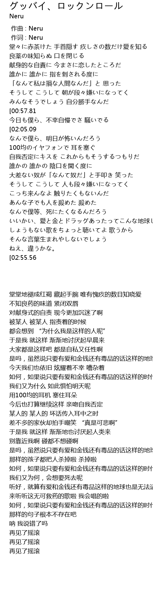 | [03:05.45][02:55.56][02:45.70] | グッバイ、ロックンロール |